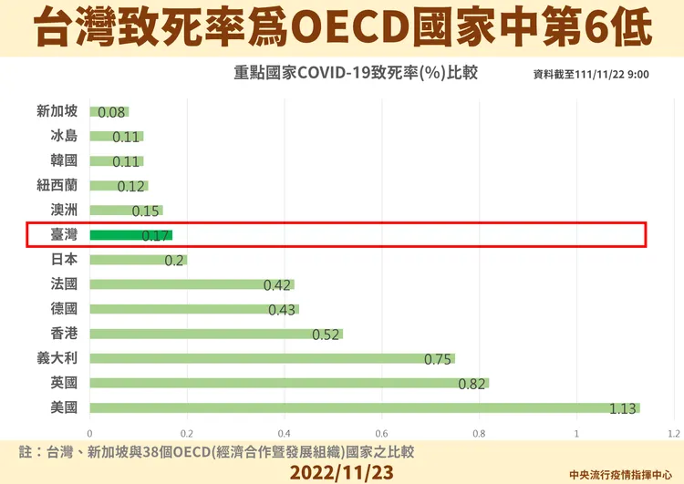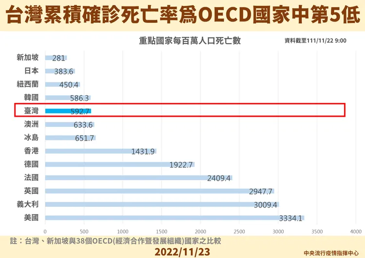 王必勝表示,截至今天上午,台灣的新冠肺炎致死率在OECD國家中排名第6低、僅0.17%,累積確診死亡率則是OECD國家中第5低,為每百萬人592.7人,這樣看長期數據比較公允、客觀。