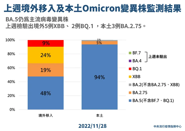 指揮中心說明,世界衛生組織(WHO)於今年11月23日資料指出,全球已發現超過500種Omicron次分支變異株,其中超過260種為BA.5次分支變異株;目前BA.5變異株占比約為72.1%,仍為全球主流株且持續變異,由其衍生之BQ.1變異株傳播快速,受影響國家數及病例數持續增加,已於至少73個國家檢出,佔比升至23.1%;BA.2變異株衍生之BA.2.75及XBB等變異株佔比持續增加,已分別於至少75個及47個國家檢出,佔比分別約6.8%及3.3%,另BA.4.6變異株佔比近期持續下降,已降至約2.8%,需持續密切監測國際間之病毒株演變與流行。