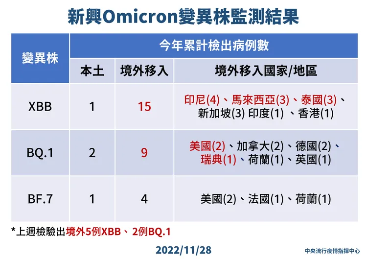 指揮中心表示,針對國內境外移入之21例BA.5、BA.2.75、XBB、BQ.1個案,為11例男性、10例女性,年齡介於未滿10歲至70多歲,入境日介於今年11月7日至11月16日。其中檢出10例BA.5分別自日本及柬埔寨(各2例),加拿大、印尼、法國、荷蘭、新加坡及德國(各1例)移入;4例BA2.75個案分別自印尼、泰國、馬來西亞及越南(各1例)移入;5例XBB個案分別自馬來西亞(3例)、印尼及泰國(各1例)移入;2例BQ.1個案分別自美國及瑞典(各1例)移入。