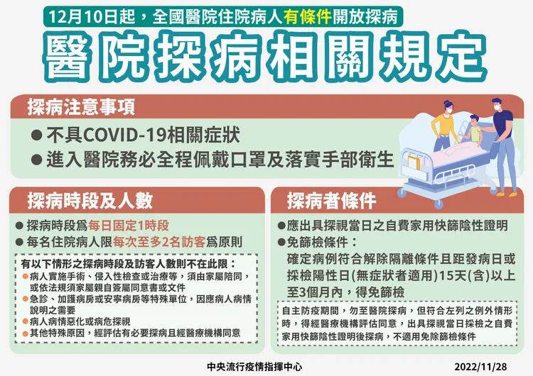 今年12月10日起,全國醫院住院病人有條件開放探病,探病時段為每日固定1時段,每名住院病人每次至多2名訪客為限,但符合下列例外情形者,探病時段及訪客人數不在此限: