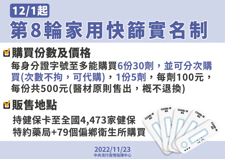 今年12月1日起,實施第八輪家用抗原快篩試劑實名制,及第六輪0-6歲學齡前幼兒與第四輪65歲以上長者免費領取1份(5劑)快篩試劑。