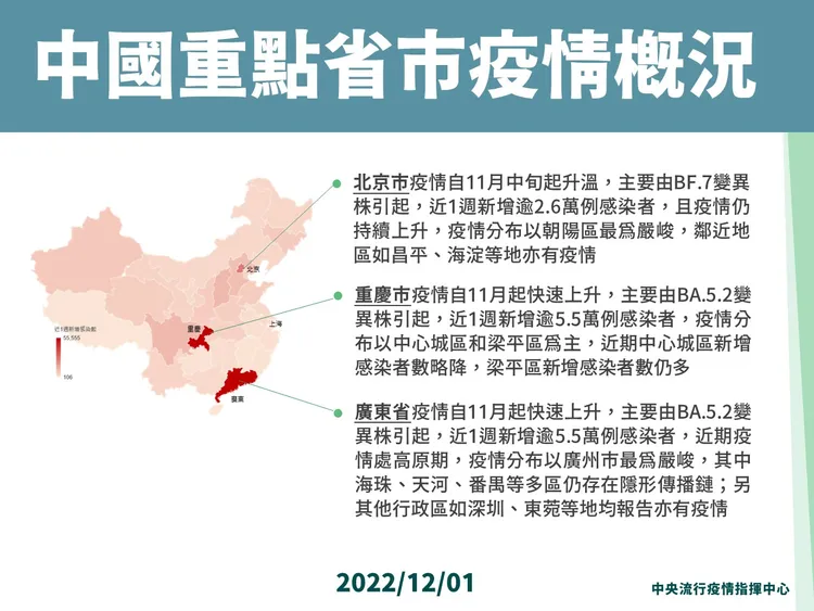 此外,王必勝說,廣東是中國的疫情熱區之一,當地疫情自11月開始快速上升,流行的主流株為「BA.2」、「BA.5」,重慶也呈現相同流行狀況;至於北京,王必勝表示,當地疫情約會晚2周出現,主要流行的變異株則為「BF.7」,指揮中心將會持續監測。