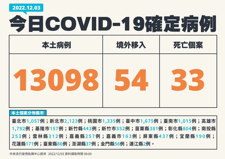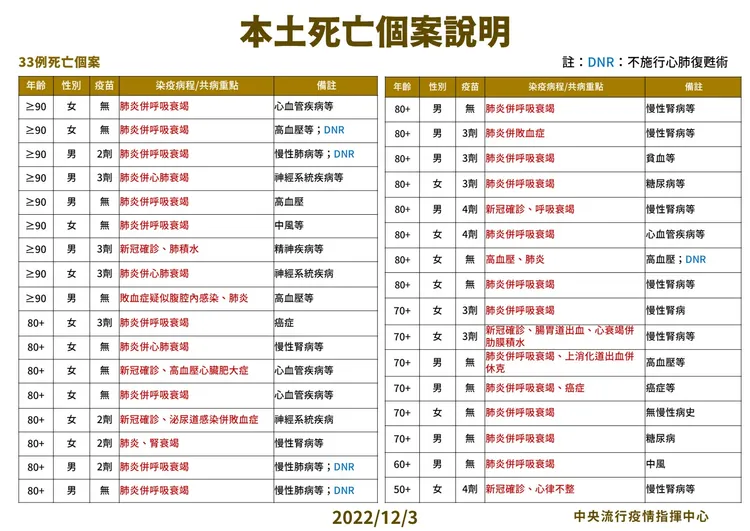 對於死亡個案,指揮中心指出,今日新增33例本土病例死亡個案,為15例男性、18例女性,年齡介於50多歲至90多歲以上,皆屬重度感染、32例具慢性病史、21例未接種3劑以上COVID-19疫苗。確診日介於今年9月30日至11月30日,死亡日期介於5月18日至11月30日。