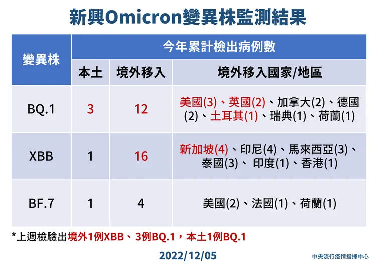 指揮中心表示,截至目前國內今(2022)年累計檢出之Omicron亞型變異株境外移入確定病例:XBB為16例、BF.7為4例、BQ.1為12例、BA.5為1,251例、BA.4為104例、BA.2.75為83例、BA.2為1,028例;另累計本土確定病例XBB為1例、BF.7為1例、BQ.1為3例、BA.5為1,391例、BA.4為5例、BA.2.75為5例、BA.2為2,532例。