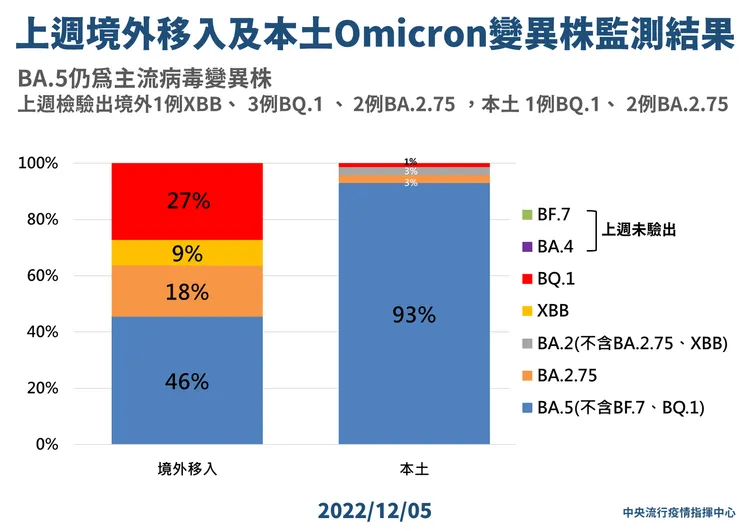 醫療應變組副組長羅一鈞表示,境外、本土變異株仍以BA.5為主,境外佔46%,本土佔93%,目前BQ.1來源仍以美、英、土耳其等歐美國家為主,XBB上週則新增一例新加坡個案,本週驗出境外1例XBB、3例BQ.1、2例BA.2.75、5例BA.5;本土檢出66例BA.5、2例BA.2、2例BA.2.75和1例BQ.1,其中BQ.1本土個案為北部70多歲女性,10/5曾確診,11/18咳嗽就醫,醫師懷疑重複確診,檢驗確定。