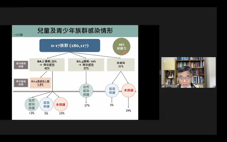 針對兒童及青少年族群感染,陳秀熙示警,根據BA.2以及BA.5通報資料推估,0-17歲族群具有疫苗保護力占48%,這代表將近一半沒有社區免疫保護力,當有新型變種病毒入侵仍可能引起感染。