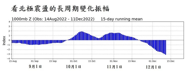 鄭明典今也在臉書提到,這次負北極震盪影響時間可能較久,「預期可能會持續到年後」,因指標轉負值之後持續往下,很明顯有長周期的變化成分。