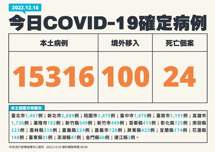 針對今增確診,指揮中心表示,今日新增15,316例本土病例,為6,830例男性、8,473例女性、13例調查中,年齡介於未滿5歲至90多歲以上,個案分布為新北市(2,889例),臺中市(1,978例),桃園市(1,875例),高雄市(1,736例),臺北市(1,487例),臺南市(1,191例),彰化縣(725例),新竹縣(549例),新竹市(449例),屏東縣(423例),苗栗縣(415例),雲林縣(316例),嘉義縣(224例),南投縣(223例),基隆市(182例),宜蘭縣(174例),花蓮縣(148例),嘉義市(126例),臺東縣(91例),金門縣(66例),澎湖縣(47例),連江縣(2例)。