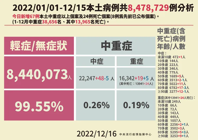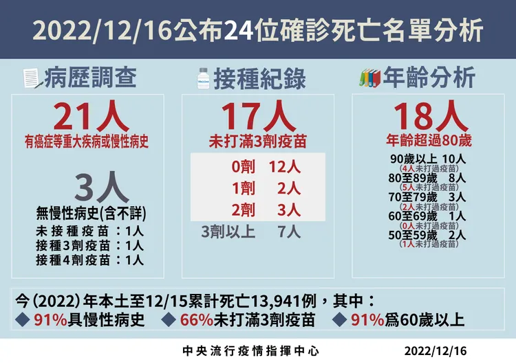 據統計,今年本土至12月15日累計死亡13941例,其中91%具慢性病史、66%未打滿3劑新冠疫苗、91%為60歲以上。