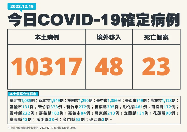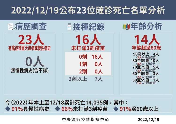 指揮中心指出,今日新增23例本土病例死亡個案,為10例男性、13例女性,年齡介於50多歲至90多歲以上,皆屬重度感染且具慢性病史、16例未接種3劑以上COVID-19疫苗。確診日介於今(2022)年6月1日至12月15日,死亡日期介於6月1日至12月16日。