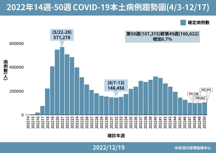指揮官王必勝指出,上週為第50週,確診總人數逾10萬人,較第49週增加6.7%,但幅度較小,而今天較上週同日減少4.7%,是持續上升或持平仍有待觀察,近期也進入冬天較冷的階段,呼籲民眾儘速接種疫苗。