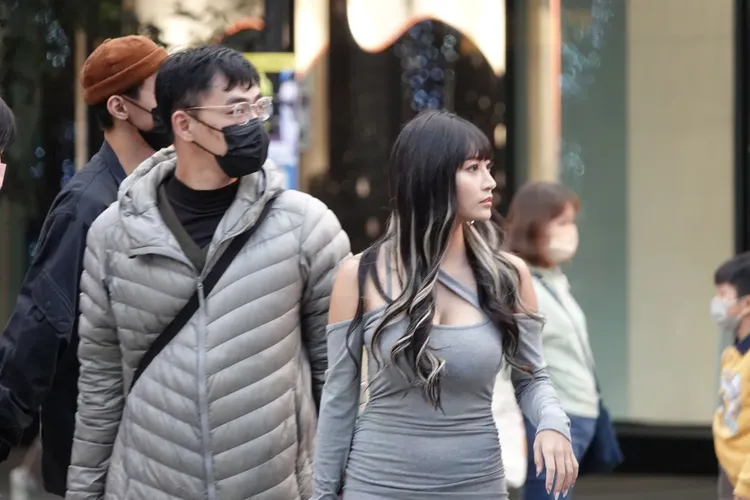 攝影大哥當天捕捉到「天氣美眉」這麼巧就是歌手祈錦鈅,她毫不畏懼台北的低溫,不僅「無罩」上街外,身上還僅穿了一件相當薄的緊身爆乳裝,特別的剪裁不僅露出白皙香肩外,胸前的事業線也一覽無遺!有別於身旁的男性路人穿著羽絨外套包緊緊,祈錦鈅的火辣替氣溫提升不少度。