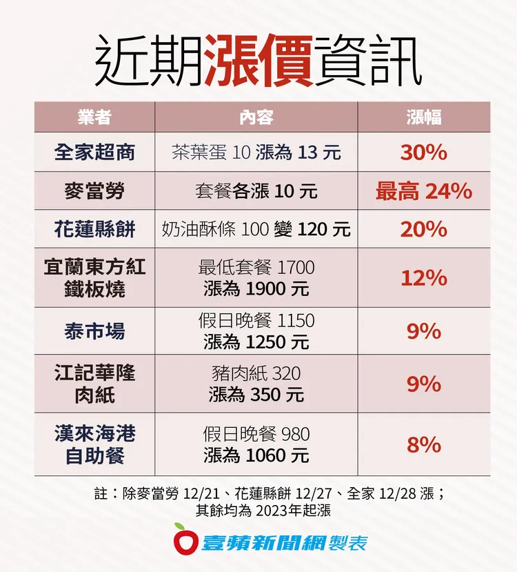九合一大選,高物價也被視為執政黨敗選原因之一,總統蔡英文本月6日才宣布祭出「經濟三箭」,其中一項就是要穩定民生物價。不到10天就有龍頭速食業者麥當勞喊漲,檢視近期物價波動,至少已有7家業者宣布調漲,物價蠢動。
