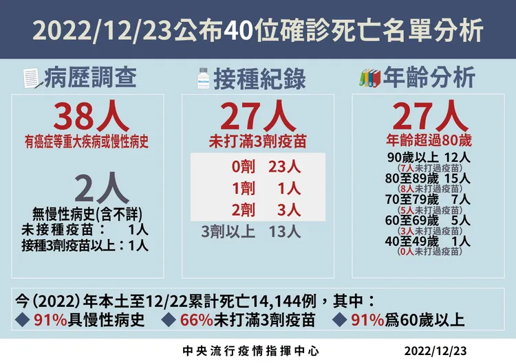 對於死亡個案,指揮中心指出,今日新增40例本土病例死亡個案,為24例男性、16例女性,年齡介於40多歲至90多歲以上,皆屬重度感染、38例具慢性病史、27例未接種3劑以上COVID-19疫苗。確診日介於今年10月27日至12月20日,死亡日期介於12月13日至12月20日。