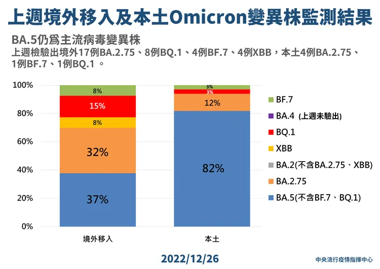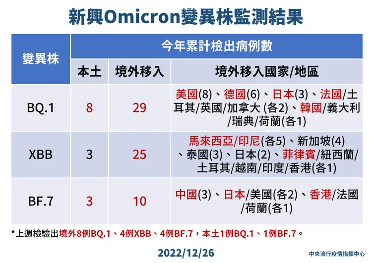 指揮中心表示,境外移入BA.5 共20例,BQ.1有8例、XBB有 4例、BF.7有 4例。境外移入定序含中國7例,其中BA.5.2共5例、BF.7共2例,與日前中方文件提到的變異株相同,目前沒有檢測到其他特殊變異株。