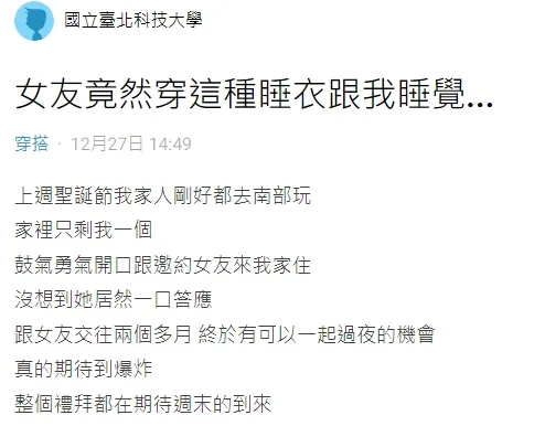 男大生在論壇Dcard發文表示,上周聖誕節家人剛好都去南部玩,鼓氣勇氣開口邀約女友來家裡住,沒想到她居然一口答應,跟女友交往兩個多月,終於有可以一起過夜的機會,真的整個禮拜都期待到爆炸。