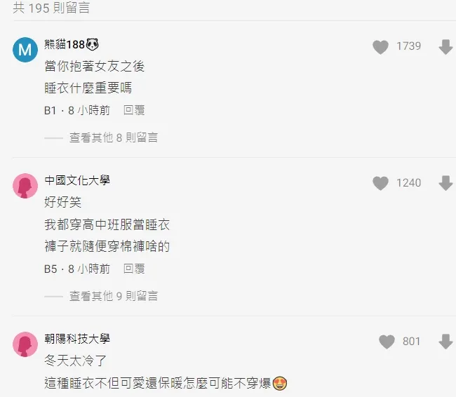網友笑說,「冬天太冷了,這種睡衣不但可愛還保暖,怎麼可能不穿爆」、「正常啊 可愛又保暖,現在超冷欸!!夏天就是系服班服+高中運動褲」、「冬天穿毛毛睡衣很舒服欸......不要片子還是動漫看太多,以為女生都會穿可愛睡衣睡覺啦XDDDD」。還有網友說,「當你抱著女友之後,睡衣什麼重要嗎?」、「反正最後都會不見,嘻嘻」、「反正你都會脫掉,有差嗎」。
