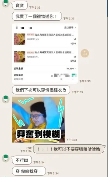 而且過了兩天,女友居然也幫他買了一件卡通睡衣,她甚至已經想好了要他穿派大星,她自己要穿海綿寶寶,他哀怨地說,「真的跟我以為的女生睡衣不太一樣...女生真的都會穿這種睡衣嗎?」