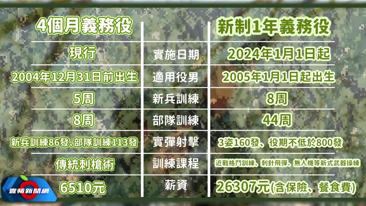 1年義務兵役制自2023年公告滿1年後,將從2024年1月1日起實施,未來義務役男的月薪也將提高至20300元。