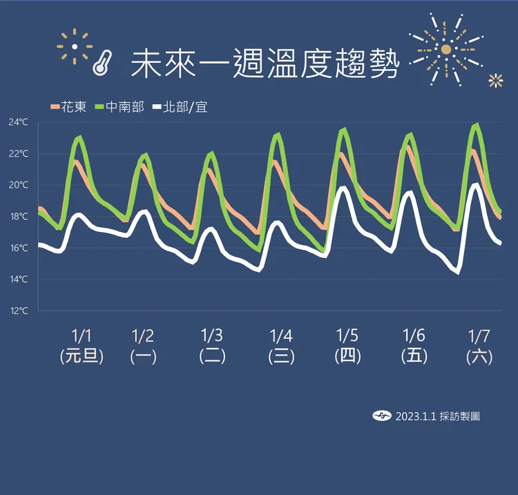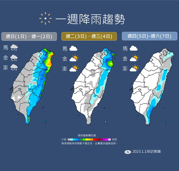 若以一周天氣狀況而言,氣象局表示,周二、周三(1/3、1/4)東北季風持續影響,北部及東北部天氣較涼,其他地區早晚亦涼;迎風面的桃園以北、東半部地區及恆春半島有局部短暫雨,基隆北海岸及東北部地區有雨且有局部較大雨勢發生的機率,其他地區為多雲到晴;週二因仍有殘餘的中層雲系,西半部山區也有零星短暫雨;此外,東部、東南部(含蘭嶼、綠島)及恆春半島沿海有長浪發生的機率。