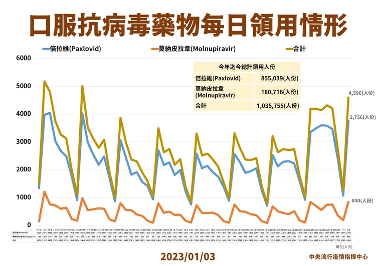 針對口服抗病毒藥物每日領用情形,羅一鈞指出,隨著本土疫情升溫,上一周和今日公布數據顯示,領藥人數有增加趨勢,但2款口服抗病毒藥物庫存量足夠,倍拉維還有26.5萬人份,莫納皮拉韋還有7.6萬人份。分別可使用3個月和5個月,民眾、醫師無須擔心。