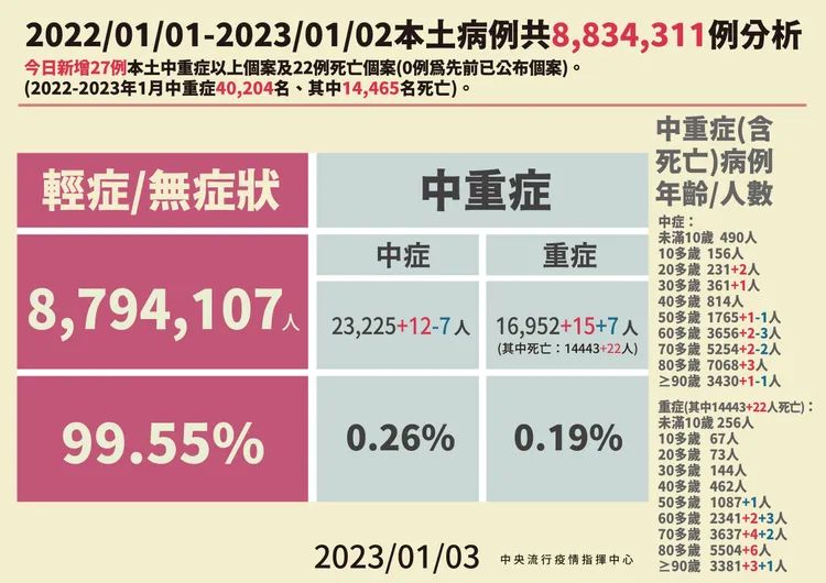 此外,在今增確診病例中,有中重症27例,包括中症12例、重症15例。