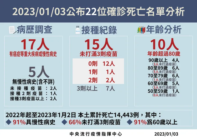 對於死亡個案,指揮中心指出,今日新增22例本土病例死亡個案,為13例男性、9例女性,年齡介於50歲至90多歲以上,皆屬重度感染、17例具慢性病史、15例未接種3劑以上COVID-19疫苗。確診日介於去年12月4日至12月31日,死亡日期介於12月24日至12月31日。