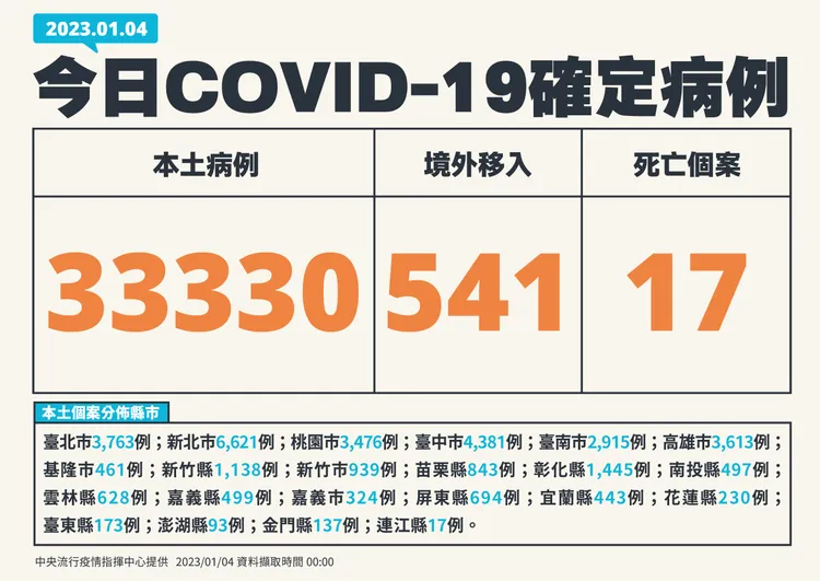 針對今增確診,指揮中心表示,今日新增33,330例本土病例,為15,334例男性、17,974例女性、22例調查中,年齡介於未滿5歲至90多歲以上,個案分布為新北市(6,621例),臺中市(4,381例),臺北市(3,763例),高雄市(3,613例),桃園市(3,476例),臺南市(2,915例),彰化縣(1,445例),新竹縣(1,138例),新竹市(939例),苗栗縣(843例),屏東縣(694例),雲林縣(628例),嘉義縣(499例),南投縣(497例),基隆市(461例),宜蘭縣(443例),嘉義市(324例),花蓮縣(230例),臺東縣(173例),金門縣(137例),澎湖縣(93例),連江縣(17例)。