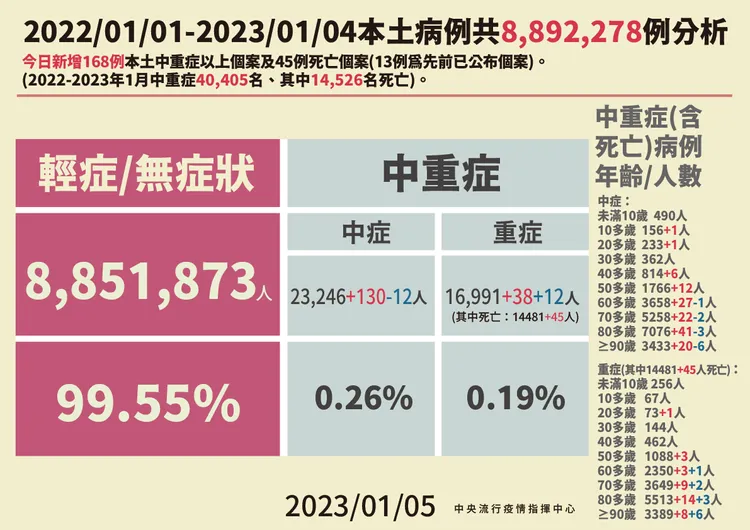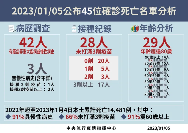 對於死亡個案,指揮中心指出,今日新增45例本土病例死亡個案,為22例男性、23例女性,年齡介於20歲至90多歲以上,皆屬重度感染、42例具慢性病史、28例未接種3劑以上COVID-19疫苗。確診日介於去年10月11日至今年1月1日,死亡日期介於去年12月13日至今年1月2日。