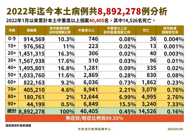 羅一鈞說明,去年1/1以來統計個案人數,新冠肺炎死亡率整體平均為0.16%,而現在台灣處於第三波疫情,第一疫情死亡率為0.189%,第二波為0.143%,看起來第二波以BA.5為主疫情,致死率比第一波下降,但有些死亡事件是在所屬疫情期結束後1到2個月後才發生,後續會再將個案的死亡事件回歸所屬疫情期別,因此數字可能還會有變動。