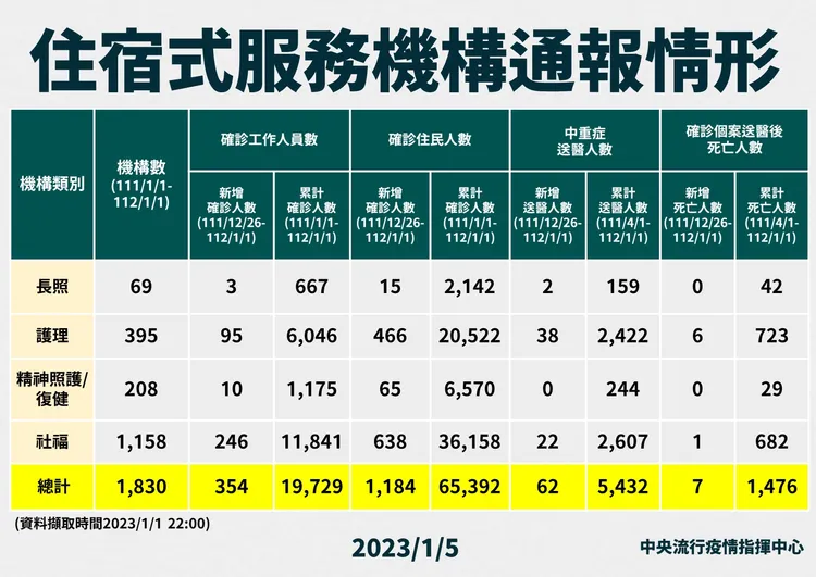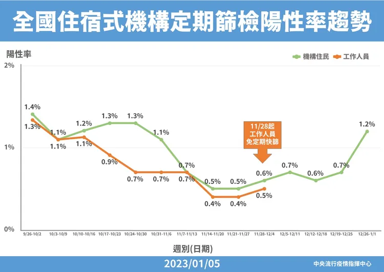 指揮中心說,考量國際間病毒變異株疫情持續,且目前國內疫情處於另一波上升階段,加上農曆春節將至,基於住宿式機構照顧較多慢性病及重症高風險族群的長者,應維持警惕,避免發生機構群聚感染風險,因此今年1月9日起至1月31日調整公費定期篩檢措施,公費試劑將陸續寄出。