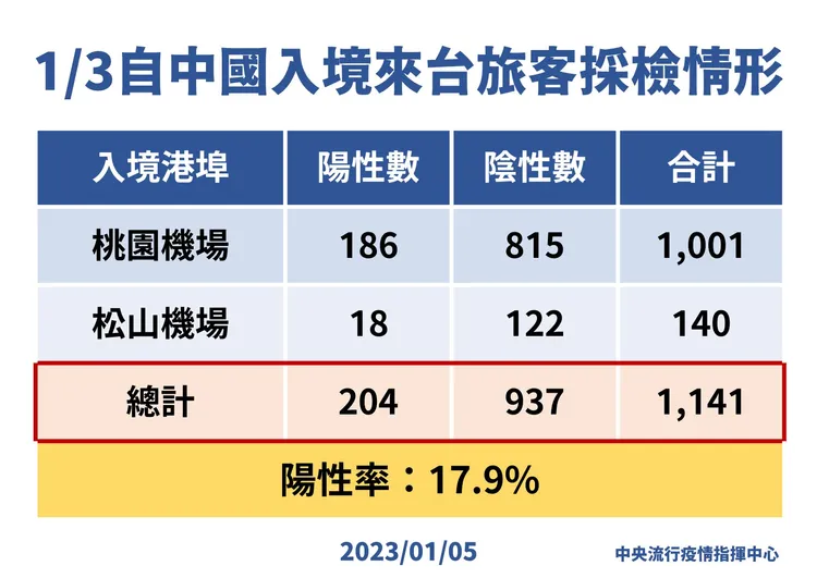 此外,針對1月3日自中國入境來台旅客採檢情形,指揮中心發言人莊人祥說明,桃園機場採檢1001人、松山機場採檢140人,總計1141人中有204人篩檢陽性,陽性率17.9%。1/1~1/3自中國入境旅客陽性率介於17.9~25%。