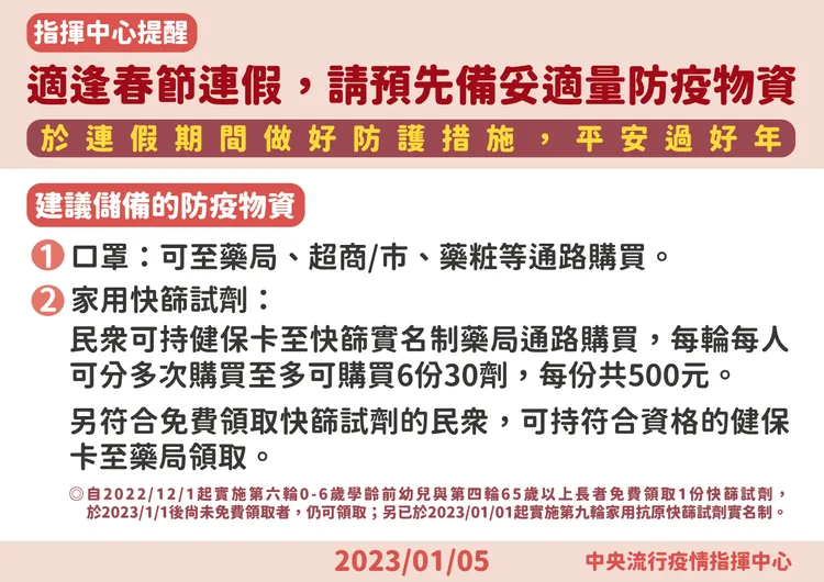 另王必勝呼籲,符合免費領取快篩試劑的民眾,可持符合資格的健保卡至藥局領取,還是希望民眾能提前準備,避免屆時碰到連假買不到防疫物資。