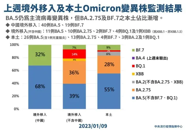 指揮中心日前公布病毒基因定序最新結果,發現國內BQ.1明顯竄起,本土感染自3%增加到14%,可能成為下一波主流,另BF.7自3%增為5%,BA.2.75自12%增至19%,BA.5自82%降到62%。至於境外移入個案檢驗,BA.5仍是主流、佔59%,其次為BF.7佔19%,BA.2.75佔14%。