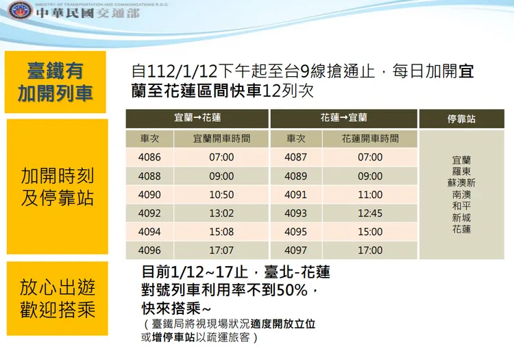 另依據東部蘇花段陸路運輸中斷SOP,交通部已要求台鐵局啟動鐵路疏運,該局於今加開6班次往返宜花,明(1/13)起增加加開至12班次,後續週休假期期間並再視運量適時加開區間車,原週末時段開行28列次加班車也均正常開行,並視旅客搭乘情況,適度開放立位或增停車站以疏運旅客。