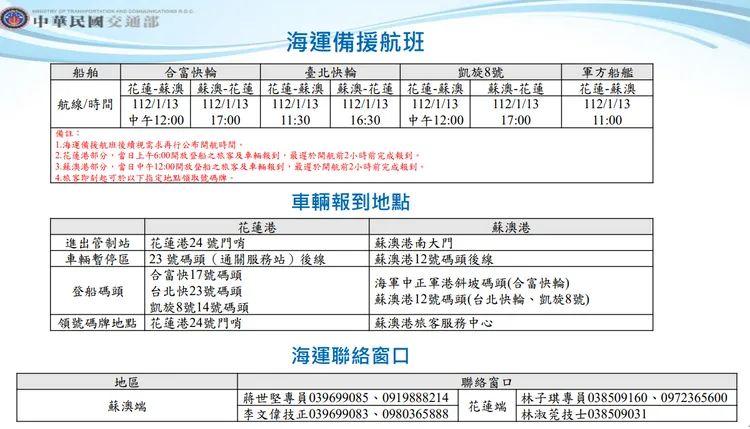 航運部分,交通部航港局也調派船舶緊急疏運,已緊急協調合富快輪投入疏運,並緊急調度臺北快輪儘速返航台灣搭配凱旋8號,於明安排投入緊急疏運,提供車輛及旅客同行接駁運輸。