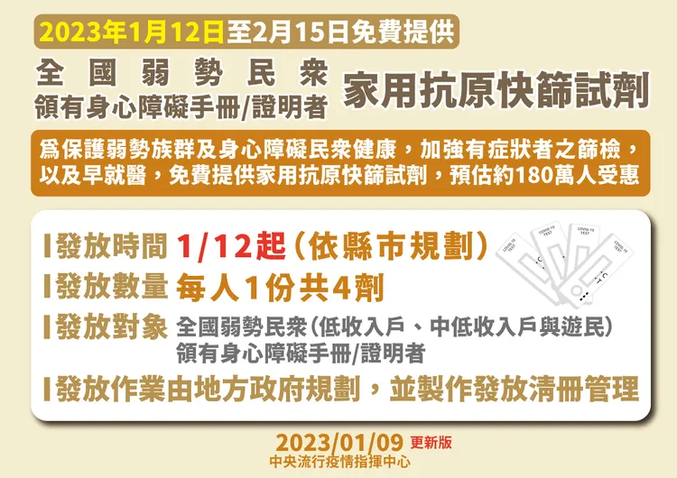 指揮中心指出,為保護弱勢族群與身心障礙民眾,將加強有症狀者的篩檢,針對部分對象免費提供抗原快篩試劑,包括全國弱勢民眾(低收入戶、中低收入戶、遊民)、領有身心障礙手冊/證明者。