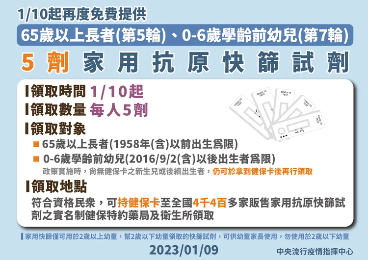 另針對65歲以上長者(第5輪)、0-6歲學齡前幼兒(第7輪),1/10起已免費提供5劑家用快篩,領取方法與先前皆相同,可持健保卡至全國4400多家實名制健保特約藥局及衛生所領取。