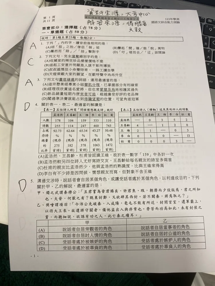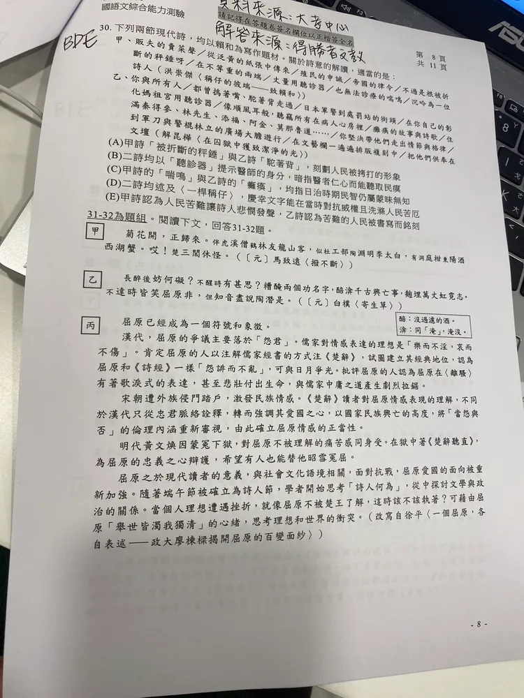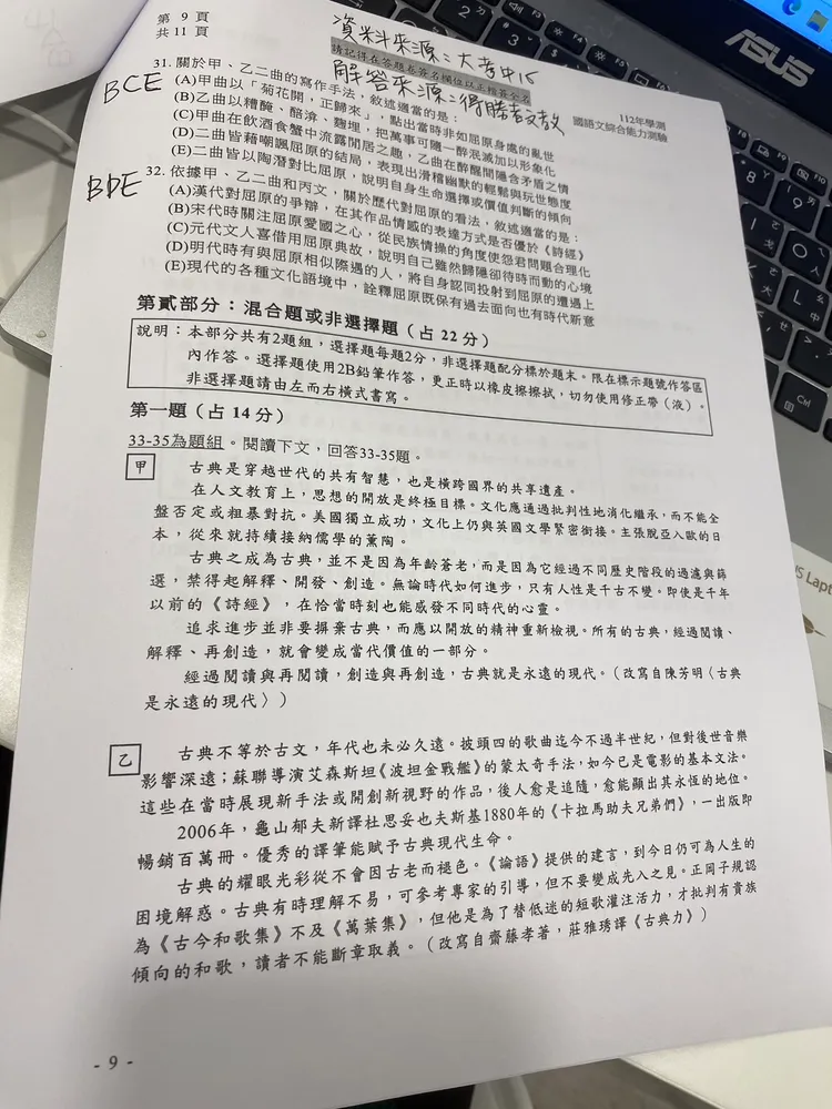 補教老師陳怡樺表示,整體來說今年題目偏難,不論是文言文、詩、曲等對讀狀況比較多,考生要有耐性,以前國學常識、應用文多多少少出現一題,但今年這兩個部分完全沒有出到,取材扣題15古文估算約佔20%左右。
