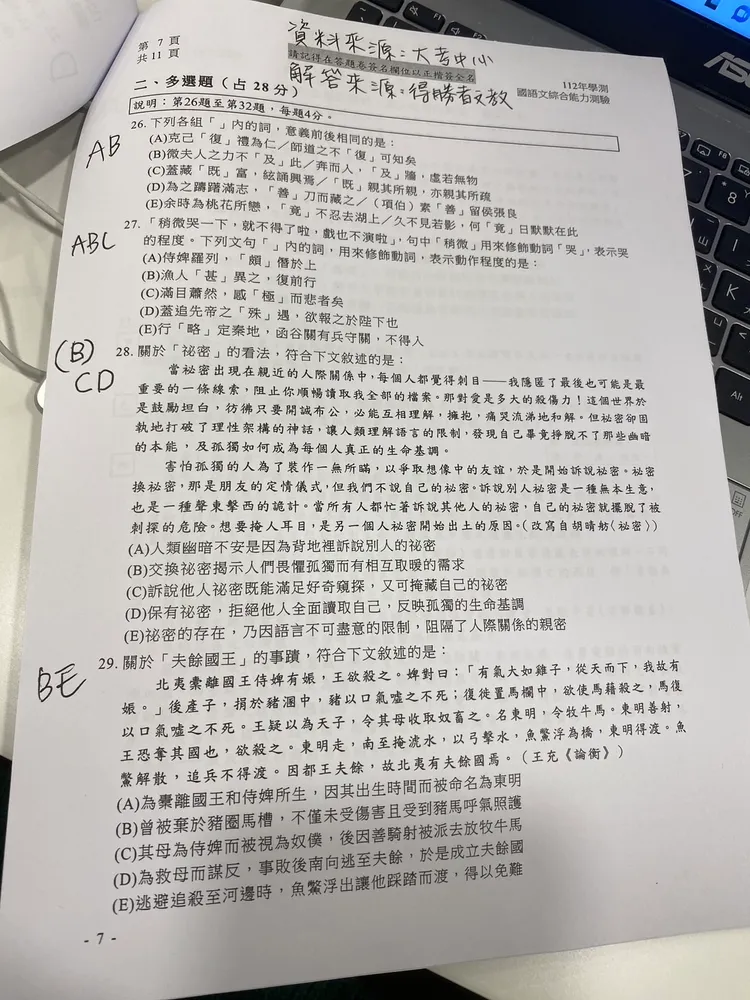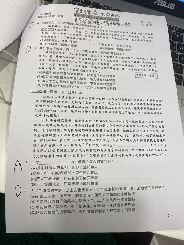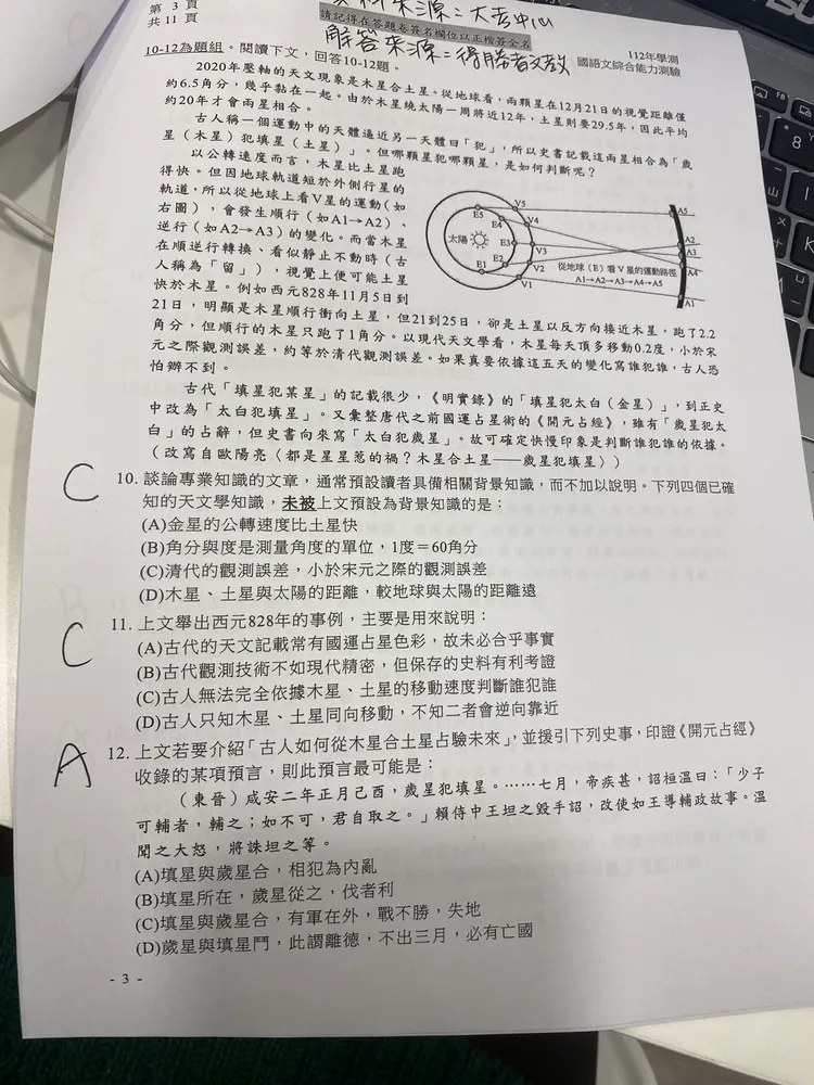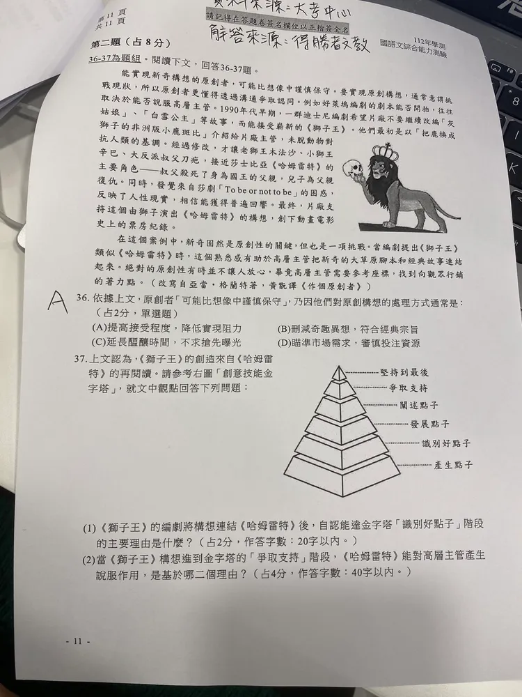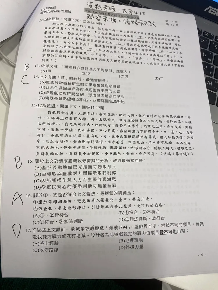 陳怡樺說,考卷有80%為閱讀理解,其廣度大到,第10至12題屬天文學跨域閱讀解讀,比較有趣如15至17題,台灣島嶼上如何重視國防,作者為日治時期作家,根據台灣海防、路戰等,提出要怎麼與別人打戰的看法,呼應現在兩岸緊張國際局勢,藉由古代文本,提示古人對此議題就已有考量;另,第23至26題別於對檳榔有口腔癌等想法,題目題到李時珍本草綱目檳榔對身體有幫助,提供多樣資料,學生要做跨域的閱讀、了解,否則有國防、天文、醫學,寫起來很辛苦。