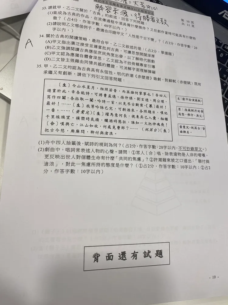 台大中文系兼任助理教授劉建志則說,即便是白話文也用運用邏輯推理能力,今年15古文少,但他仍要信心喊話,文人不會寂寞,蘇東坡今年考題就有出現。