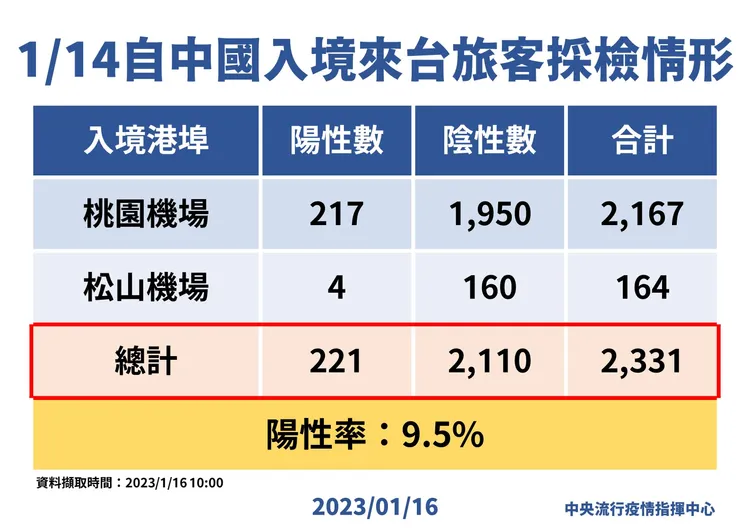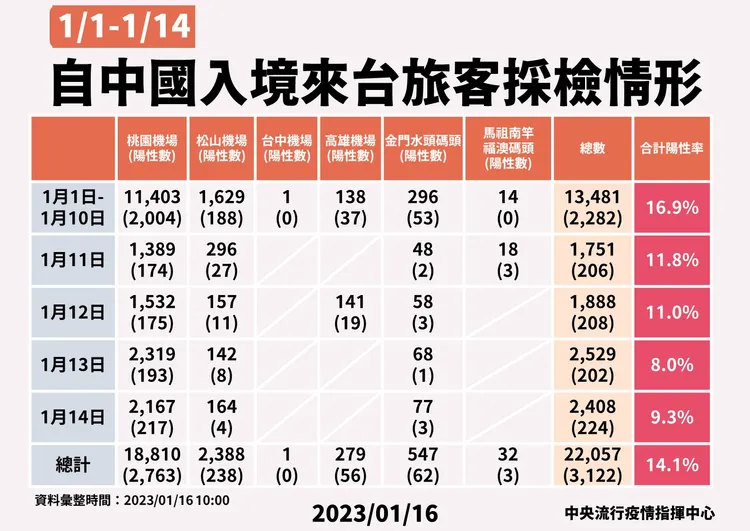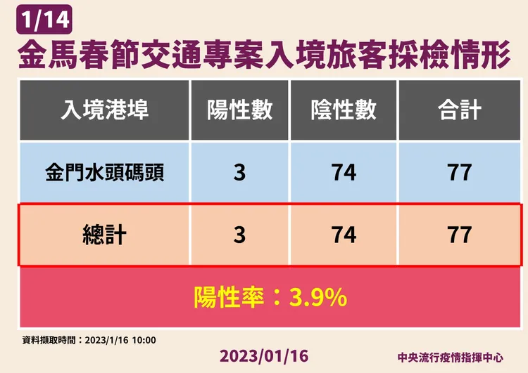 指揮中心發言人莊人祥表示,莊人祥說明,1/14經中國自桃園機場、松山機場入境旅客共2331人,進行採檢後共221位陽性,陽性率9.5%,經金馬春節交通專案(小三通)入境旅客則有77人,其中3人確診,陽性率3.9%,從機場和碼頭來台旅客整合來看,1/14陽性率為9.3%。