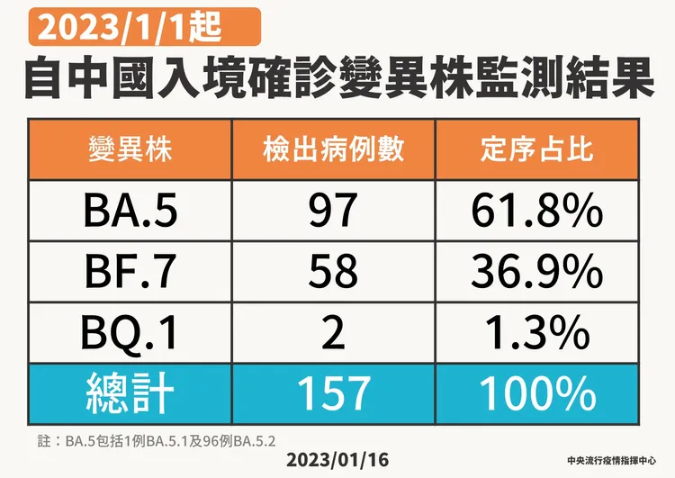 此外,王必勝說明,自1/1起針對中國來台旅客唾液PCR篩檢,總計採檢22057人,其中3122人確診,陽性率14.1%,變異株仍以BA.5佔61.8%最多,其次為BF.7的37%左右,跟國內流行的相差不大,且沒有發現新的變異株。