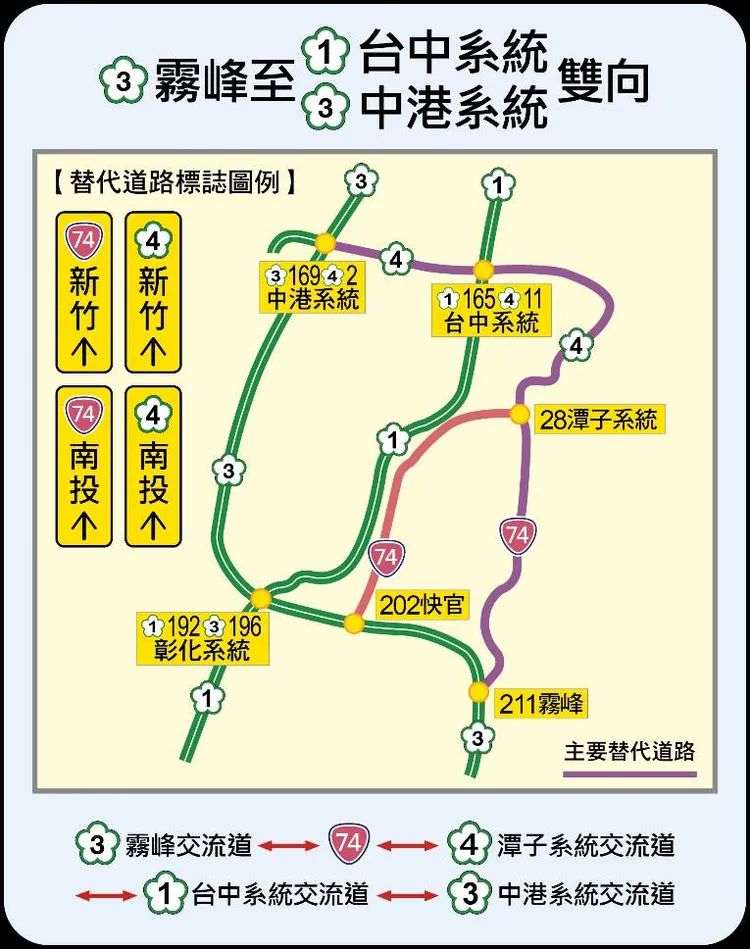 另高公局根據歷年春節連假特性及大數據分析顯示,台中都會區為國道南來北往之交通瓶頸路段,尤其是初一至初三南向每日8-13時,國1后里至大雅、國3快官至霧峰等路段;初三至初六北向每日10-23時,國1南屯至后里、國3快官至中港系統等路段,建議長途民眾可利用新通車的國4豐原至潭子路段,從國1台中系統、國3中港系統轉國4銜接台74至國3霧峰交流道,避開上述易壅塞路段,省時又方便。