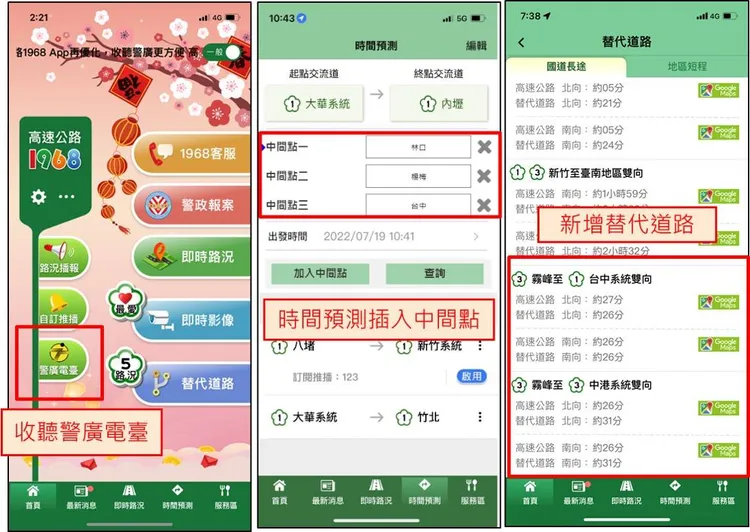 此外,高速公路1968App於春節前改版,增加「全台收聽警廣」功能、優化「旅行時間預測」服務、新增「國3霧峰至國1台中系統、國3中港系統雙向替代道路旅行時間」等服務,請民眾於春節期間多加利用規劃行程及查詢國道即時路況資訊。