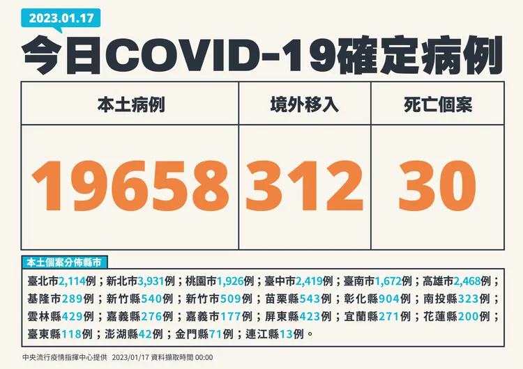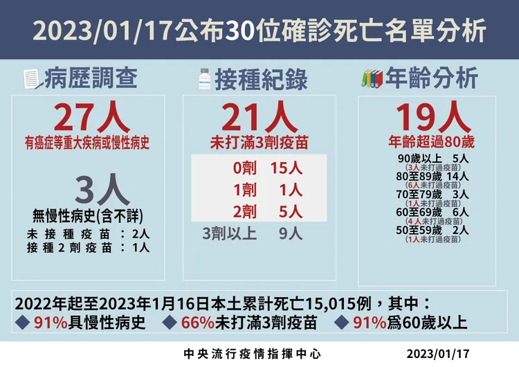 對於死亡個案,指揮中心指出,今日新增30例本土病例死亡個案,為12例男性、18例女性,年齡介於50多歲至90多歲以上,皆屬重度感染、27例具慢性病史、21例未接種3劑以上COVID-19疫苗。確診日介於去(2022)年5月17日至今(2023)年1月14日,死亡日期介於去年5月21日至今年1月14日。