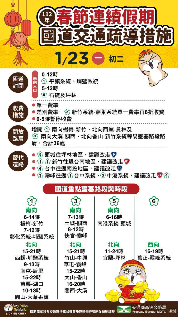 高公局建議,西部國道南向民眾可以中午以後出發,北返民眾可以在中午12點前出發,或是多利用初七、初八北返,可以避開壅塞車潮,國5南向在下午5點後出發,北返民眾則在明天早上9點前出發,替代道路部分,可以選擇台61取代國一、國三,台中往返南投地區可以改走台63,若需要經國三往返台中以北區域的話,則可改走台74以及國道4號。