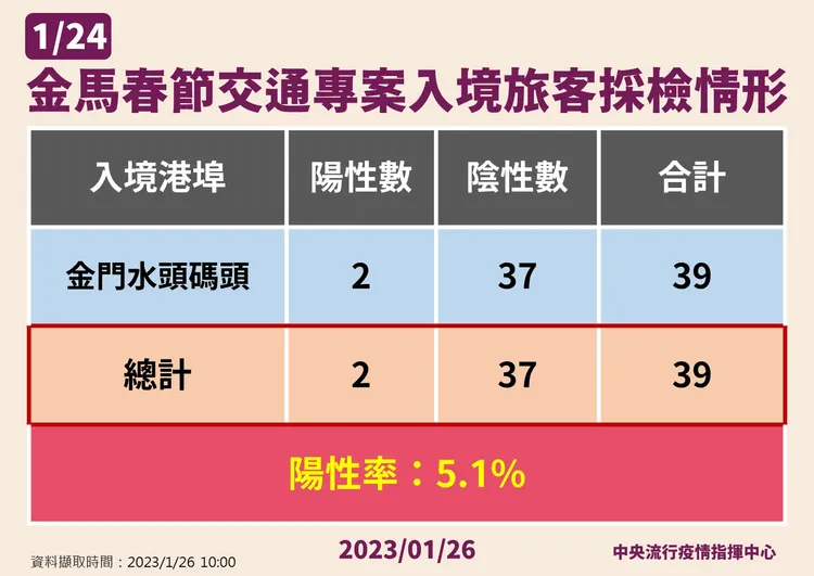 指揮中心公布,初三(1/24)經金馬春節交通專案(小三通)入境旅客採檢陽性率均為0%,不過今從金門水頭碼頭入境旅客共39人,當中採檢到2名陽性個案,整體陽性率為5.1%。