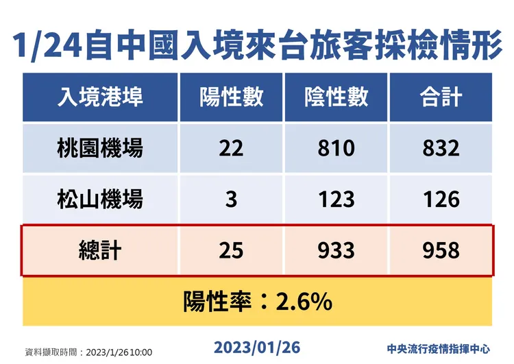 另外,到本月31日止,從中國入境旅客均須進行唾液PCR採檢,指揮中心公布,1月24日自中國入境來台旅客中,有832人自桃園機場入境,當中22名陽性個案;另126人自松山機場入境,陽性旅客有3人,整體而言陽性率為2.6%,接下來是否繼續實施,同樣預計下周討論。