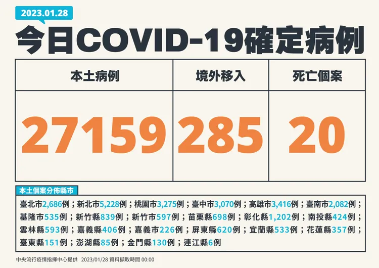 指揮中心指出,今日新增20例本土病例死亡個案,為12例男性、8例女性,年齡介於40多歲至90多歲以上,皆屬重度感染、18例具慢性病史、10例未接種3劑以上COVID-19疫苗。確診日介於去(2022)年12月7日至今(2023)年1月23日,死亡日期介於今年1月15日至1月25日。